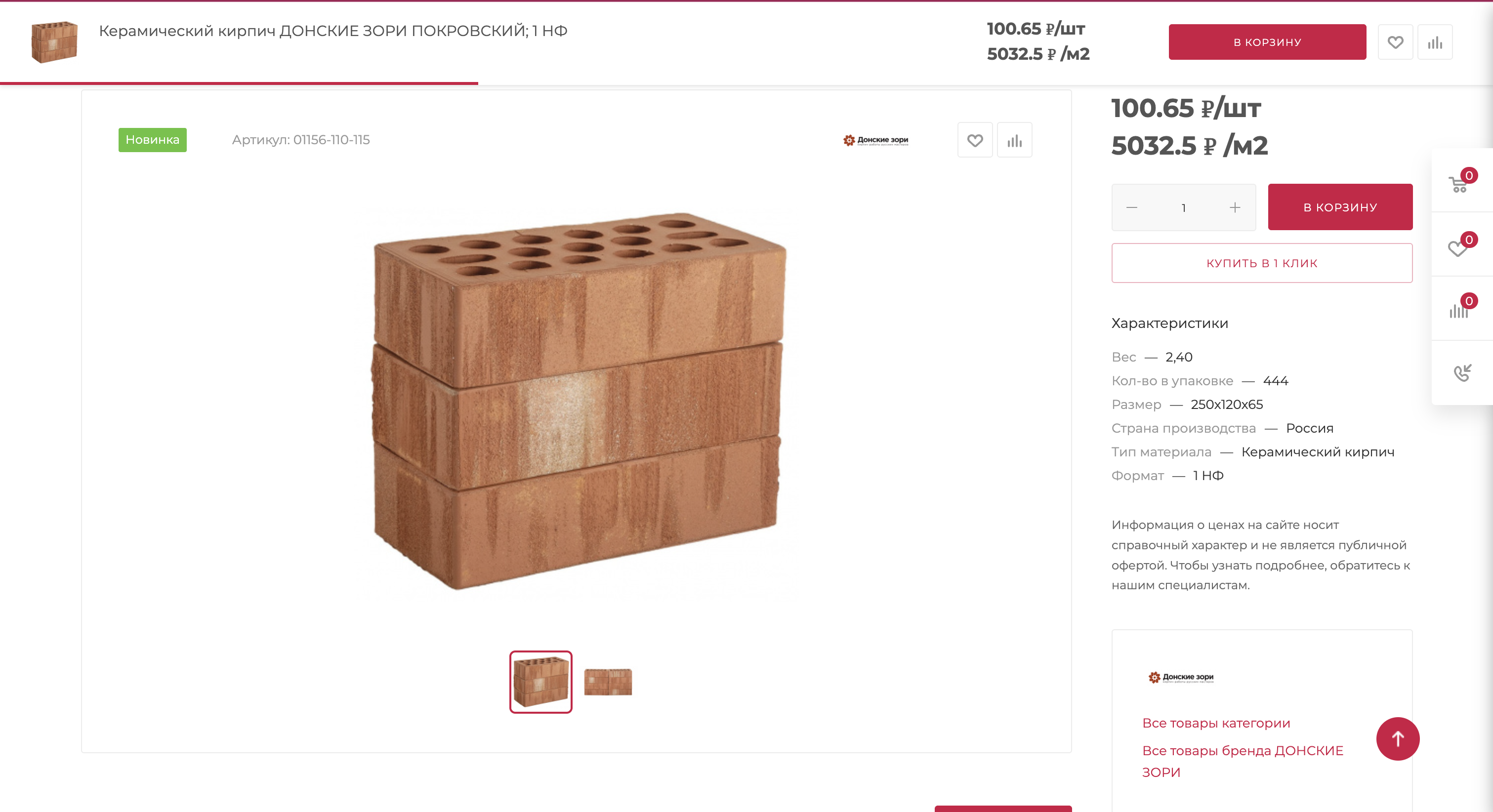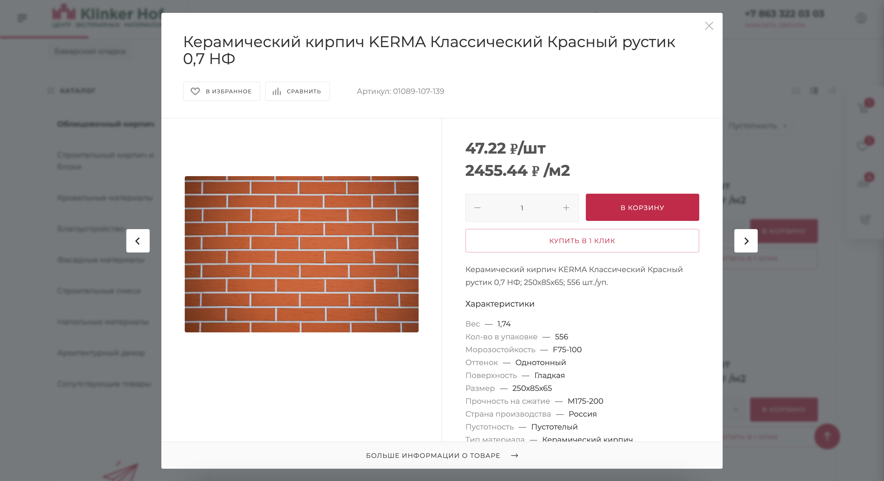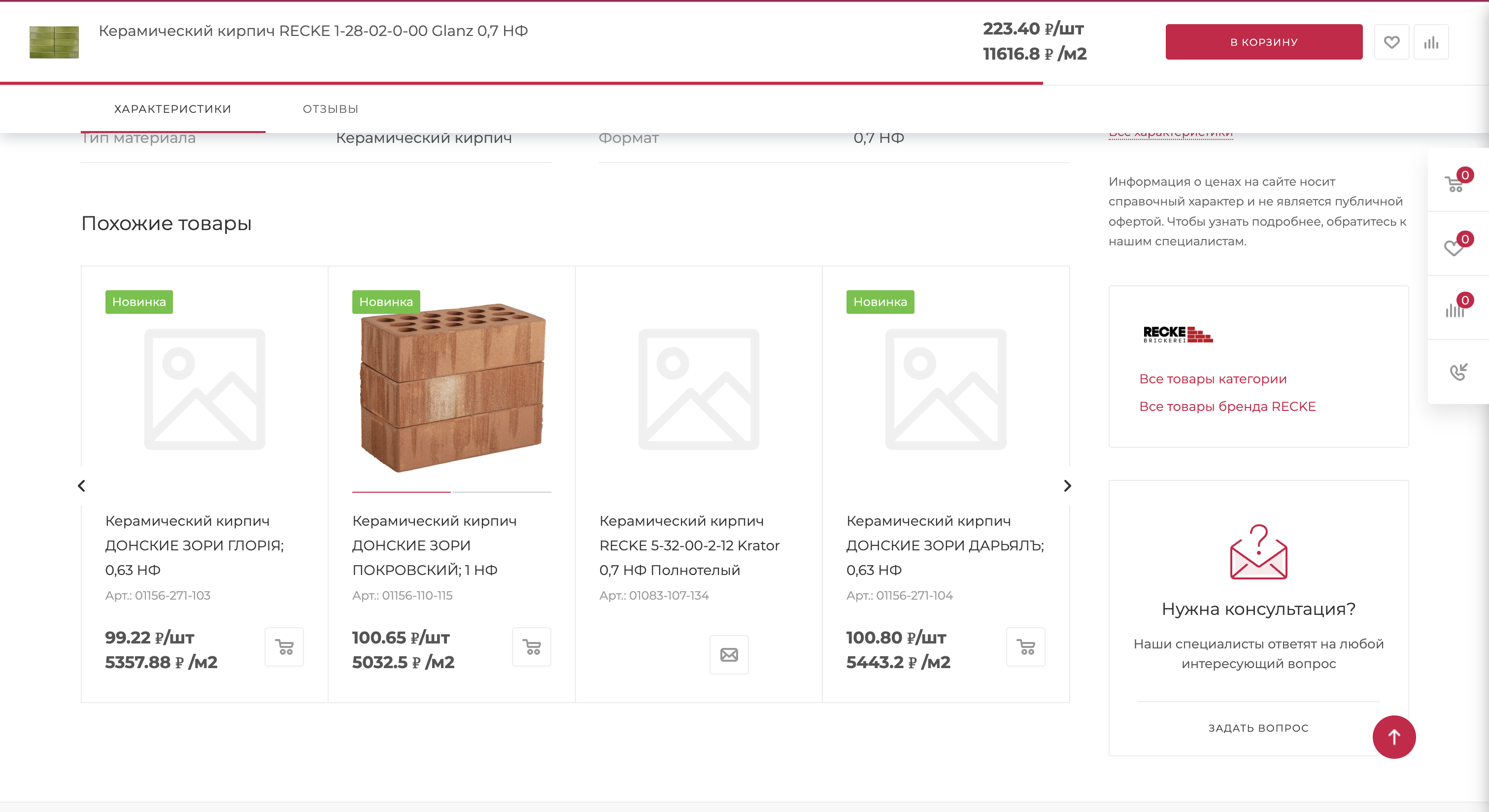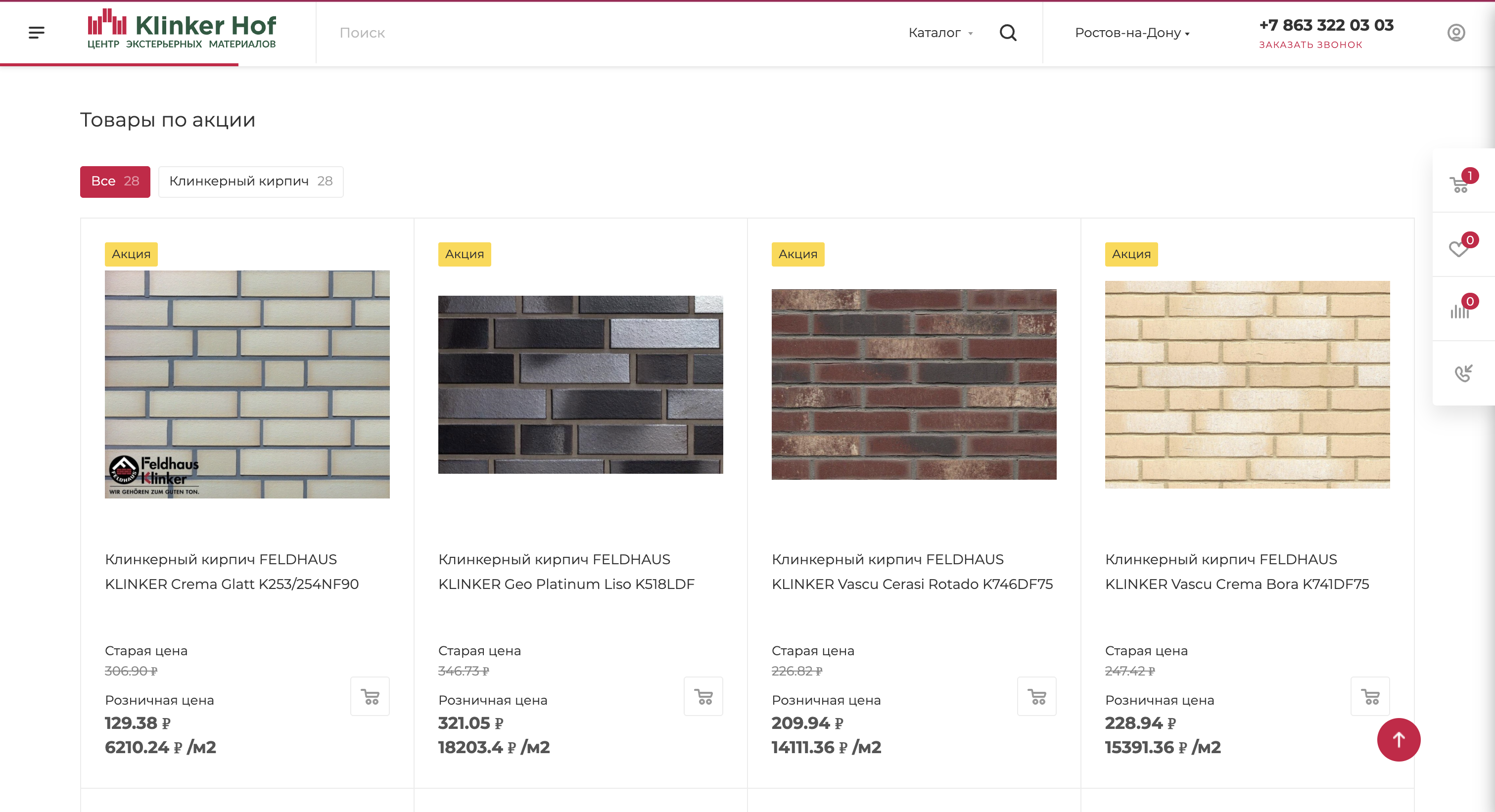В карточках товаров мы кастомизировали отображение стоимости: покупатель видит цену за единицу и дополнительный пересчёт за квадратный метр, что критично для облицовочных материалов и повышает прозрачность выбора.
