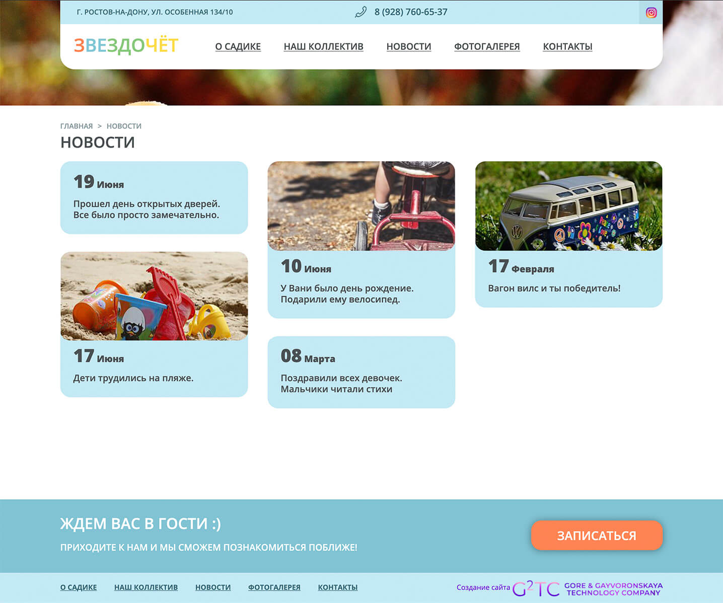- Структура разделов: «О садике», «Коллектив», «Новости», «Фотогалерея», «Контакты».
