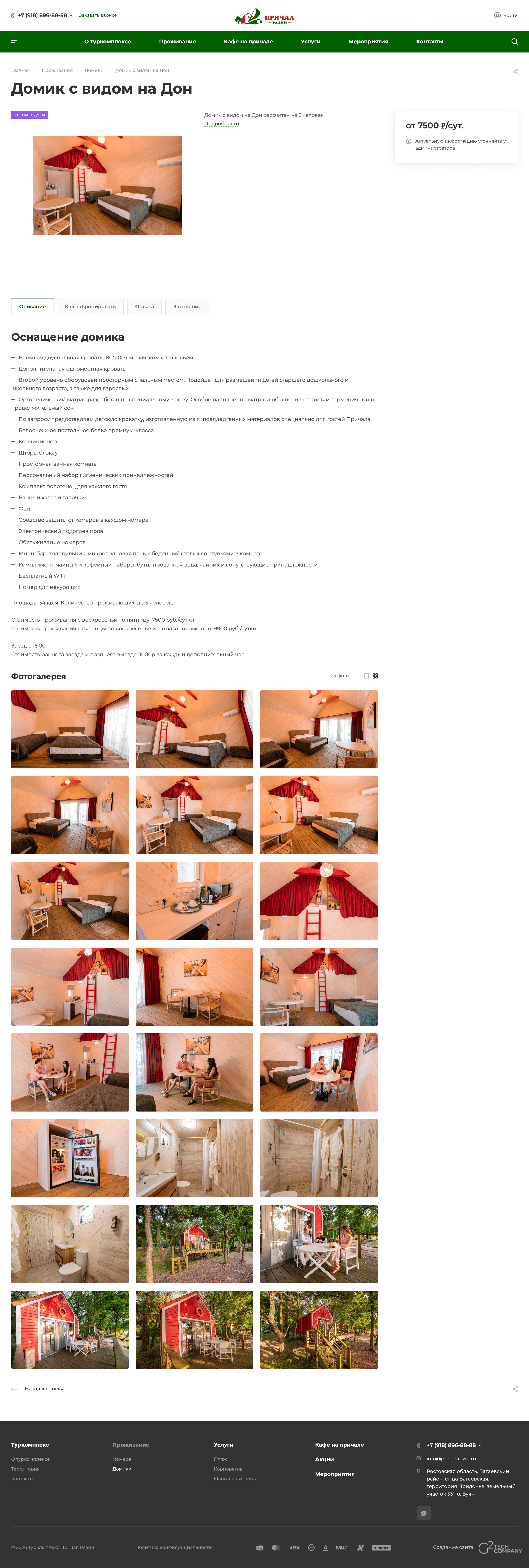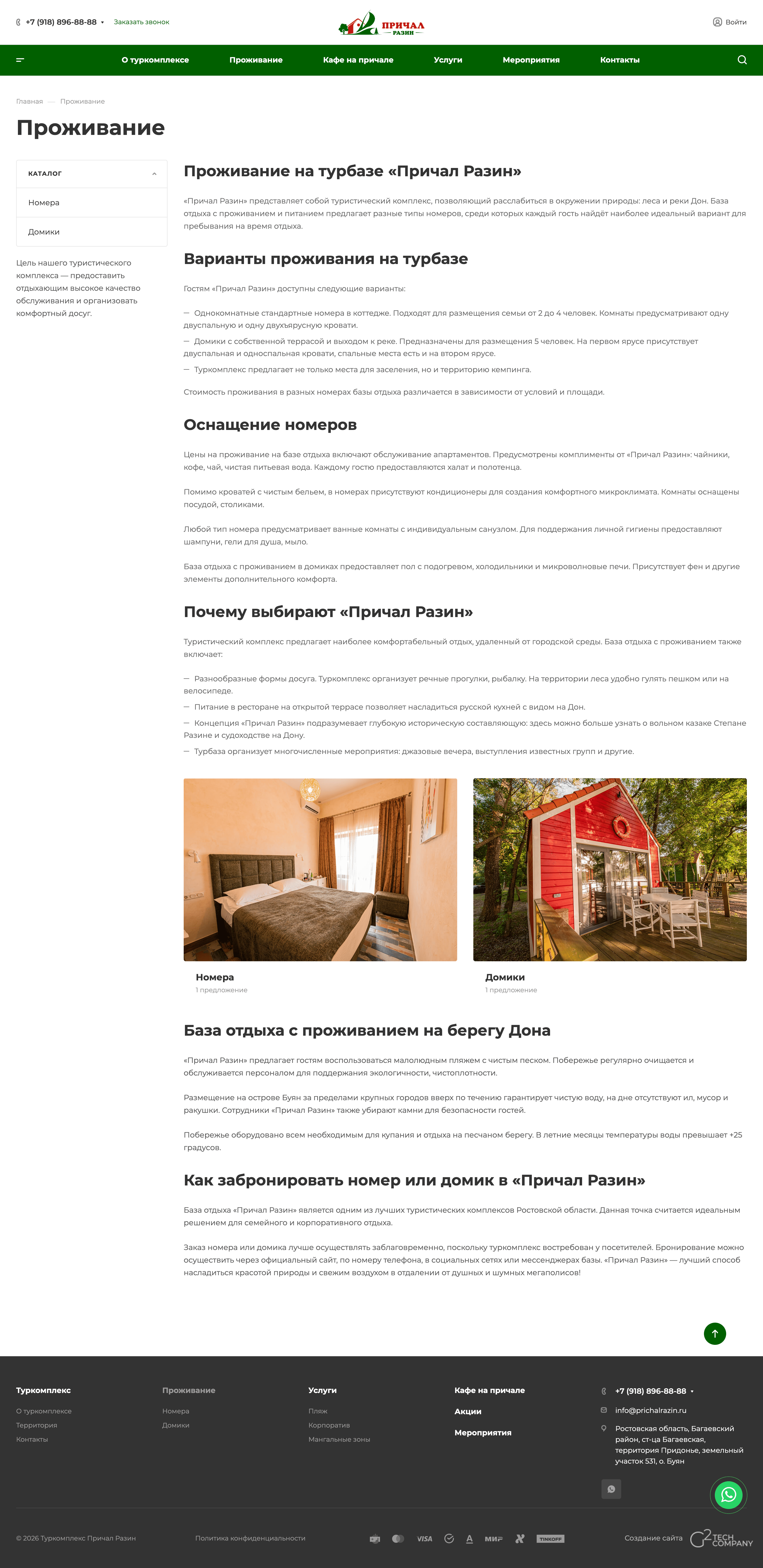На страницах проживания пользователь видит варианты «Номера» и «Домики», может перейти в конкретный вариант и получить полный набор ответов: описание, оснащение, стоимость, правила заезда/выезда, способы оплаты и понятную инструкцию «Как забронировать». Это снижает количество вопросов и повышает конверсию в заявку.
