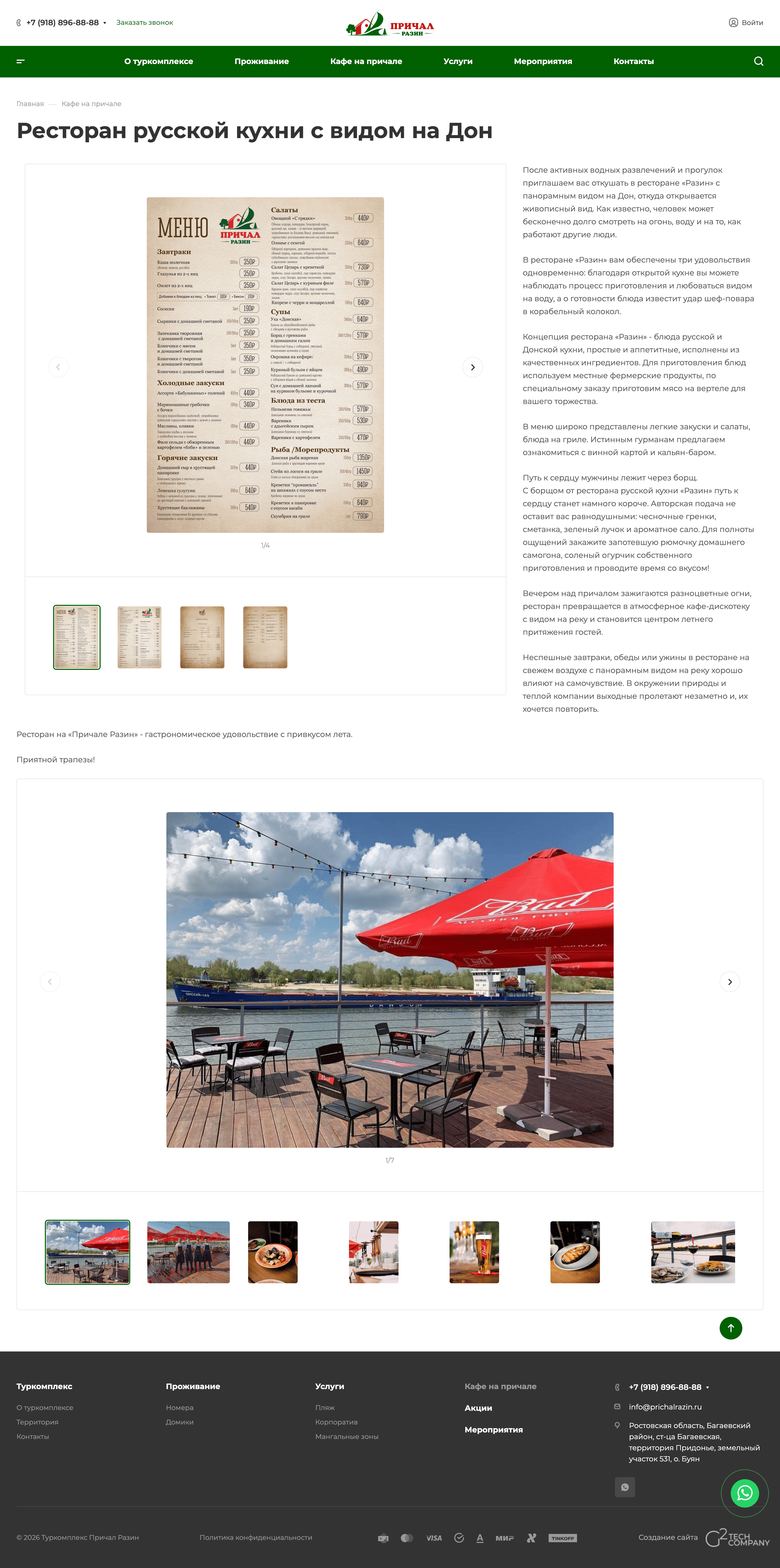 В нише туризма выигрывает тот, кто даёт гостю максимум ясности и уверенности. Поэтому мы усилили проект контентом: подробные страницы по проживанию, услугам и инфраструктуре, понятные ответы на типовые вопросы и фотогалереи, которые показывают реальную атмосферу и уровень комфорта.